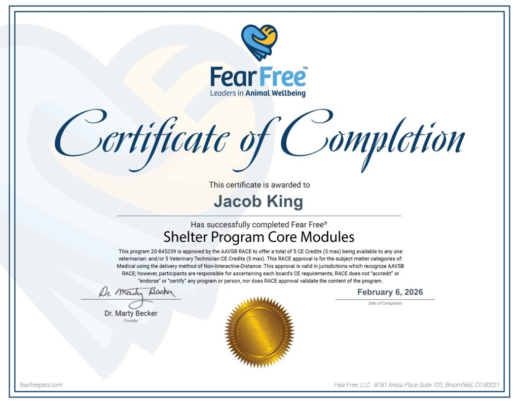 While I’m not a certified trainer, I have worked extensively and directly with several independent dog trainers, training teams, and dog behaviorists. My knowledge and experience is vast and I’m always trying to improve. I’m Fear Free Certified, Pet First Aid and CPR Certified
